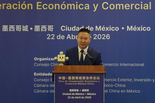 2026年4月22日,驻墨西哥大使陈道江出席“中国—墨西哥经贸合作论坛”并致辞。中国贸促会会长任鸿斌、墨参议院亚太委主席波列文斯基、墨经济部国际关系司司长哈斯等百余人参加。