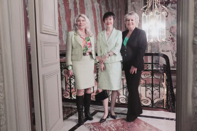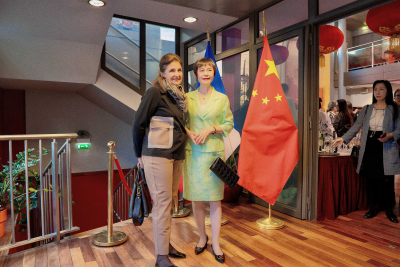 步入文化中心,院中绿草茵茵、芳菲明媚。一侧的西式古典楼原为孟德斯鸠伯爵公馆,雕梁画栋间无不镌刻着十九世纪的典雅浪漫;另一侧是以东方古塔为建筑灵感的现代楼,衬以粉墙黛瓦、蕉亭竹影,呈现一幅中西合璧的优美画卷。现场布置简约而不失东方意蕴,青花点缀、丝竹映壁,处处流露着中华美学的温润雅致,也彰显着中法文化交融的从容气度。大厅前,中法两国国旗交相辉映,不同肤色、不同语言、不同文化背景的她们,因对美好与和平的共同向往而相聚。大使夫人张华盈盈而立,同每一位来宾执手寒暄、互贺节日。