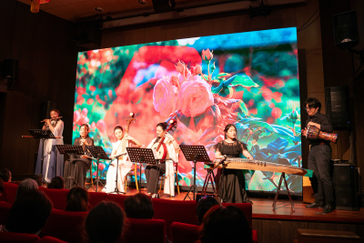 嘉宾们移步音乐厅,一场中华雅乐盛会在此上演。灯光渐暗,一曲悠扬的《春江花月夜》缓缓响起。琵琶轻拨、笛声婉转,旋律如春水般流淌,唐代诗人张若虚笔下的月夜江景如优美画卷徐徐铺展,引发听者对宇宙人生哲理的悠思;紧接着,《彝族舞曲》以明快的节奏、奔放的旋律,仿佛将观众带入彝族山寨的迷人夜色与篝火舞会;舞蹈《点绛唇》则以中国古典舞的诗意步伐,勾勒出东方女性的温婉及对爱情的憧憬;古琴曲《酒狂》的琴音古朴悠远、余音袅袅,展现出中国传统文人洒脱不羁、高远旷达的精神气质;《夜雨双唱》、《玫瑰花》等富有时代气息的新民乐作品由琵琶、古琴、箫、笛子、二胡、阮、古筝与吉他、打击乐等中西乐器共同演绎,旋律时而清丽婉转、时而明快灵动、时而激越奔放,展现出中国民乐在当代舞台上的创新活力。
